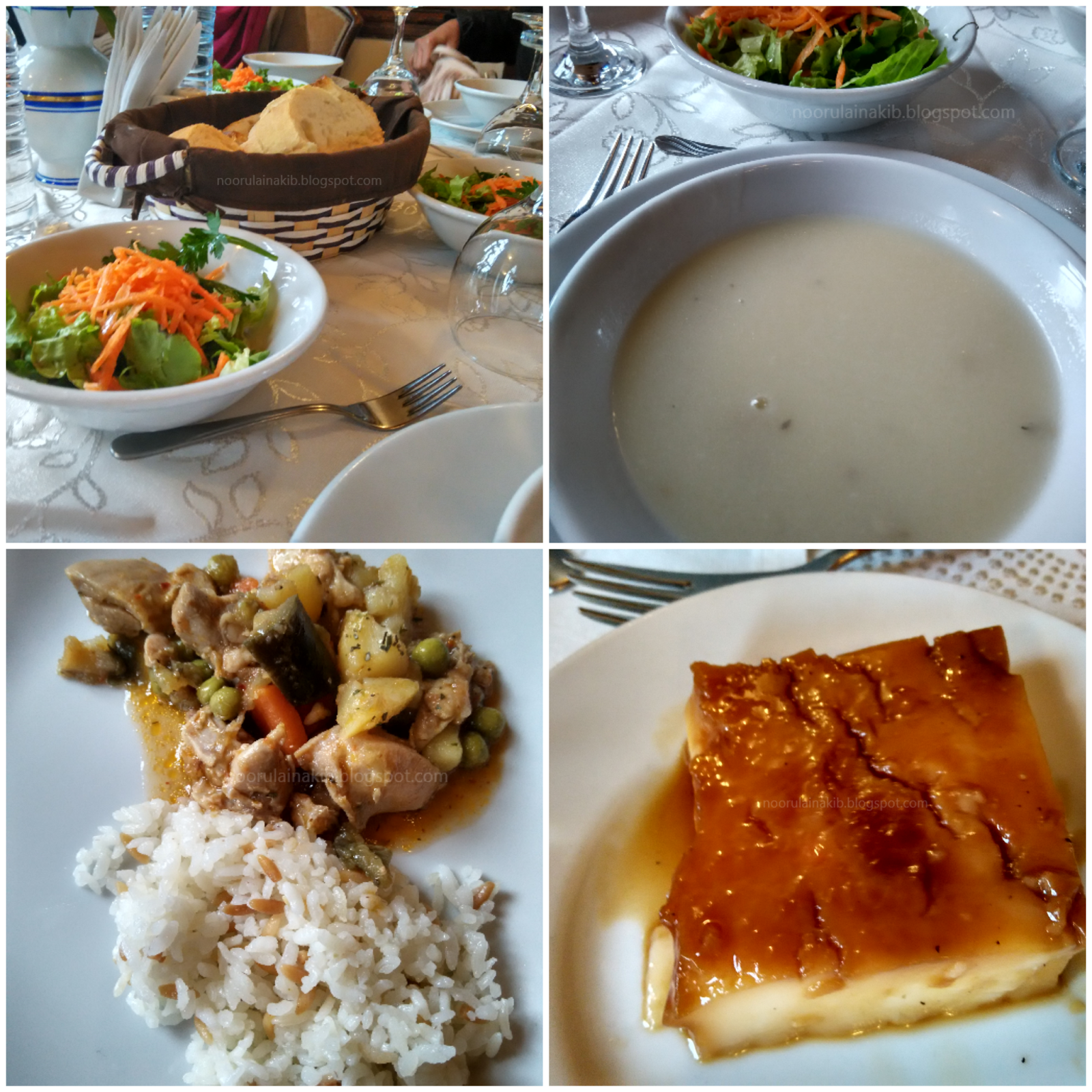 | Imej: (Arah jam) Sup cendawan, Dessert,nasi dan stew, salad dan roti |